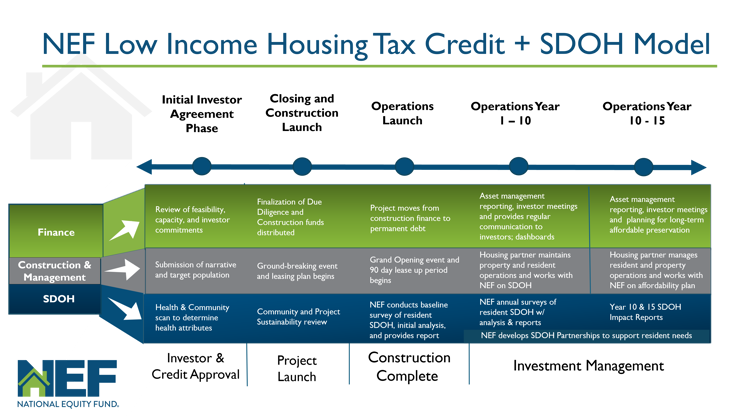 National Equity Fund serves as an experienced intermediary by connecting healthcare organizations and affordable housing investment opportunities utilizing an additional SDOH data collection and reporting mode that stretches across the term of the investment for healthcare partners. NEF's team of housing experts has assembled new innovative partnership structures that connect healthcare partners with housing partners in the communities they serve and markets where they want to grow. Housing is a key component of stabilizing at-risk communities around the country, and our team is ready to help our healthcare partners lead with new, innovative investment solutions.